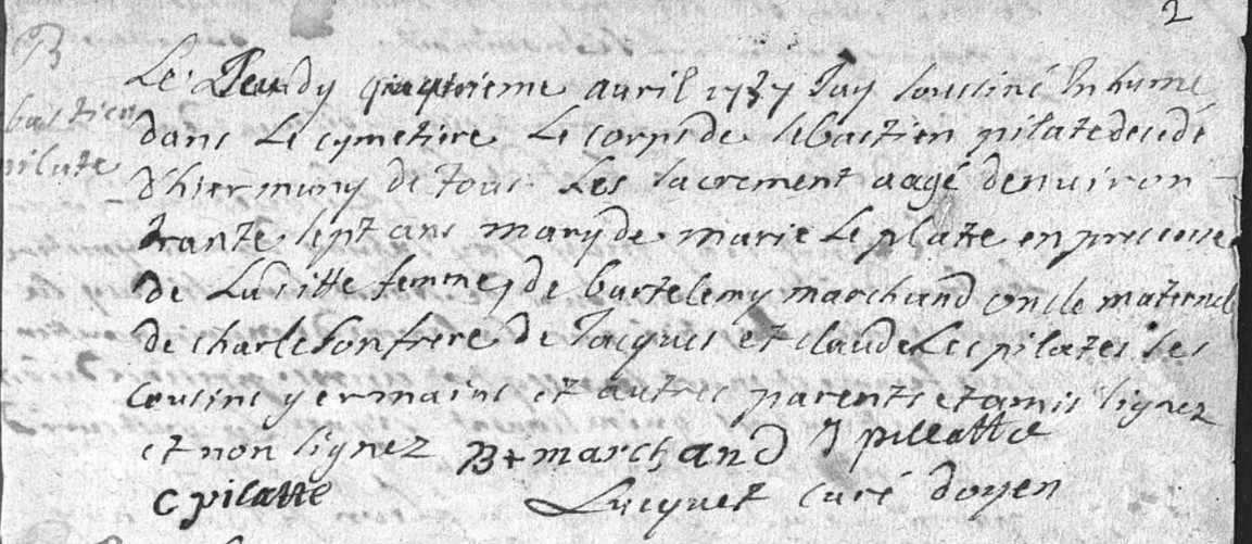 PILATE Sébastien ( °19 mars 1698 Villamblain,45310,Loiret,Centre-Val de Loire,FRANCE - 4 avril 1737 Villamblain,45310,Loiret,Centre-Val de Loire,FRANCE )